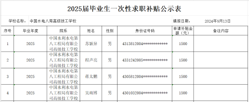 各位老師、同學(xué): 根據(jù)長沙市人力資源和社會保障局《關(guān)于做好2025屆畢業(yè)生一次性求職創(chuàng)業(yè)補貼發(fā)放的工作提示》文件精神,經(jīng)前期組織申報,學(xué)生資助中心收集資料審核,現(xiàn)將學(xué)校初審?fù)ㄟ^擬推薦名單予以公示(排名不分先后): 公示時間:2024年9月14日--2024年9月20日 對以上結(jié)果如有異議,請在公示期內(nèi)電話或書面向?qū)W生資助中心反映相關(guān)情況。學(xué)生資助中心劉定琪老師電話:15116486325;郵箱:125187@powerchina.cn