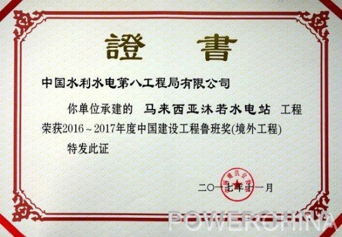 由工程局承建的馬來(lái)西亞沐若水電站工程榮獲2016-2017年度中國(guó)建設(shè)工程魯班獎(jiǎng)(境外工程)。